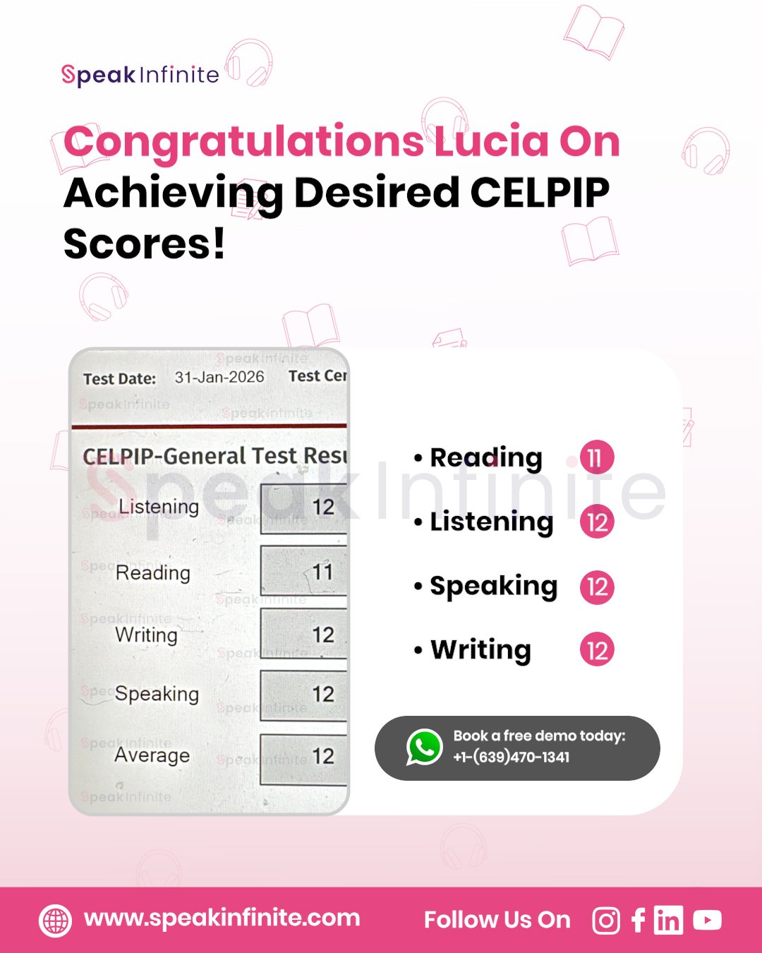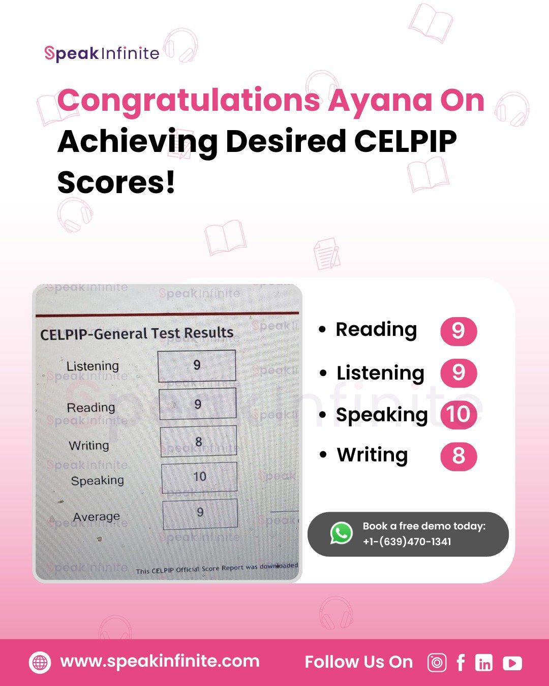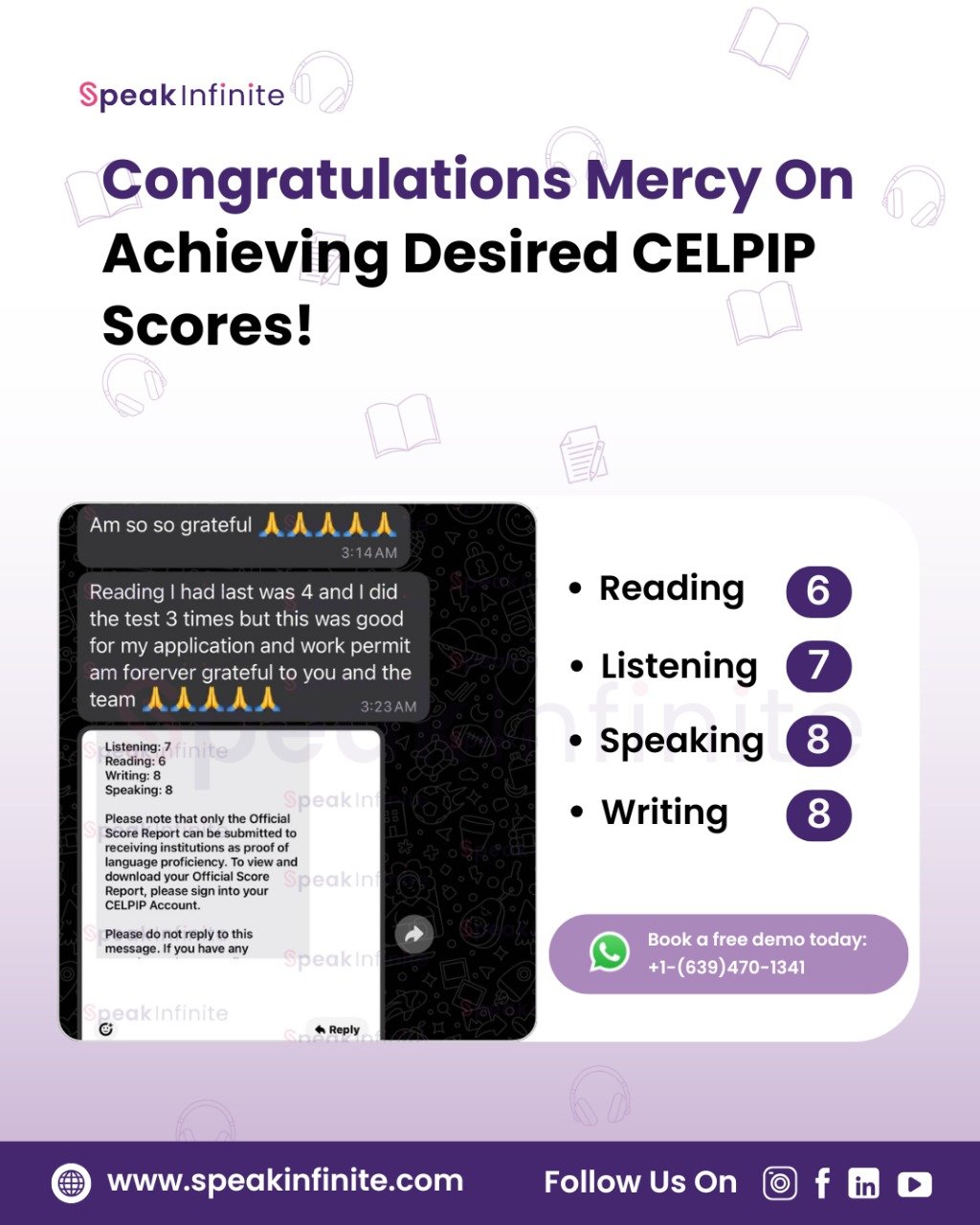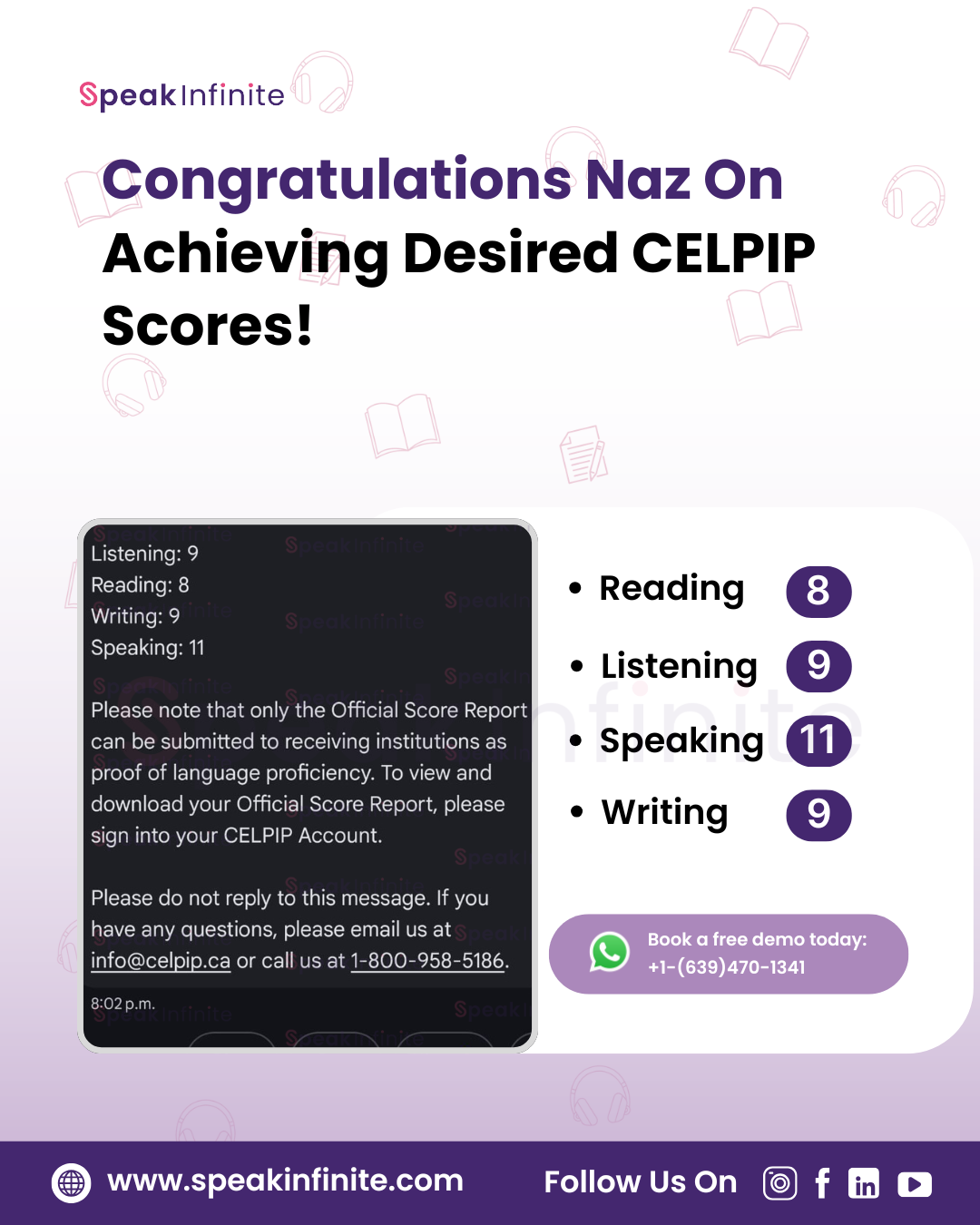 Posted on samson damilolaTrustindex verifies that the original source of the review is Google. I am happy to say Speak infinite is a good place to learn and I recommend it for anyone that want to do English test. I just had 3 days of teaching and went for my CELPIP, which turns out successful.Posted on Chelimo Mercy YeshoTrustindex verifies that the original source of the review is Google. I want to appreciate my instructor Vinn for the tremendous effort she put in to see I passed my CELPIP exam which I attempted last week! You’re truly incredible!!Posted on Ionela TopciuTrustindex verifies that the original source of the review is Google. This Institute helped me achieve more than my goal in the CELPIP General Evaluation. Thank you, Miss Indu, for your patience , your support and your perserverence! I will always remember how you pushed me to become my best! I recommend it to everyone who wants the best results for this evalution, they are the best!Posted on shiffali kaushalTrustindex verifies that the original source of the review is Google. they are very good. Mehnoor is amazing in breaking down the strategies and helped me to get my perfect score👍👍👍Posted on NDAYIZEYE NOETrustindex verifies that the original source of the review is Google. Dear Speak Infinite Team, I’m writing to express my deepest gratitude for the incredible support and guidance you provided throughout my CELPIP journey. After facing many challenges and setbacks with this test, joining your program truly made all the difference. The dedication, professionalism, and care your team showed helped me grow in confidence and finally achieve the success I had been working toward for so long — and I was able to reach my goal in a very short time. I especially want to thank the teacher who took the time to guide me with patience and clarity. Your encouragement and belief in me meant more than I can say. You not only helped me improve my skills, but also gave me the motivation to keep going when I felt discouraged. Thank you so much for everything you’ve done. I will always be grateful for the role you played in helping me move forward. Warm regards, NoePosted on welkinTrustindex verifies that the original source of the review is Google. The instructor was experienced and professional, and the comprehensive materials were helpful. She noticed my struggles with reading and provided targeted support which helped me to get Band 9. I recommend them for achieving your target score.Posted on Victor LawrenceTrustindex verifies that the original source of the review is Google. I had issues passing my CELPIP ENGLISH TEST, so I enrolled with Speak Infinite Educational Services for training. They have very good trainers and very good training resources that helped me to get the required scores I was looking for.The strategy videos I watched, explained everything in detail. I learnt how to tackle the reading section quickly. I also practiced with their online Test portal that analysed my performance and showed me the areas I need to improve on. I recommend Speak Infinite Educational Services to any one that wants to have a high score in their English Test ( CELPIP or IELTS).Posted on Helen AdenijiTrustindex verifies that the original source of the review is Google. I joined Speak Infinite after struggling to pass my exam three times. The program offered a structured way of learning that broke complicated celpip parts into manageable lessons. What stood out most was the patience and dedication of the team, they made sure I understood concepts instead of just memorizing them. The practice tests, mock test and feedback sessions were especially helpful; they showed me where I kept making mistakes and gave me the confidence to tackle the exam differently. The guidance I received through this program was what finally helped me cross the finish line and pass. If you’ve faced repeated setbacks like I did, I’d recommend Speak Infinite. It doesn’t promise shortcuts, but it gives you the tools, support, and encouragement to finally succeed.Posted on Sameer AryanTrustindex verifies that the original source of the review is Google. I had the honour of meeting Shweta Ma’am, I opted for one on one session and I can not express in words how thankful I am to her. She has the knowledge, experience and patience to teach you the required skills. I practiced day in and day out after her sessions and thanks to Shweta Ma’am, my CELPIP score was 11!!!! All I can say is, just trust her teachings and PRACTICE all the Homework she allocates!!! Thank you immensely Dear Shweta Ma’am!!!Posted on Jasleen KaurTrustindex verifies that the original source of the review is Google. Speak Infinite has been an incredible support throughout my CELPIP preparation journey. Special thanks to Jankee mam for her valuable guidance in helping me achieve my desired scores. I also appreciate the chat representative who responded to all my inquiries promptly and professionally. I would highly recommend Speak Infinite to anyone preparing for the CELPIP exam.