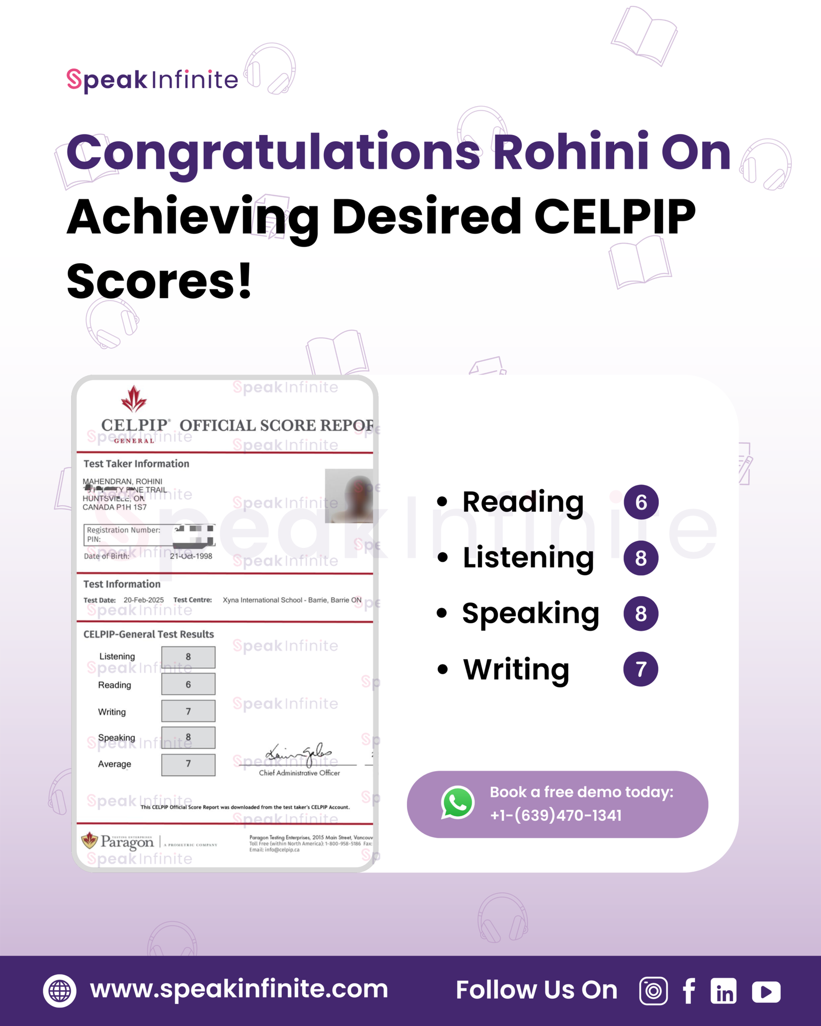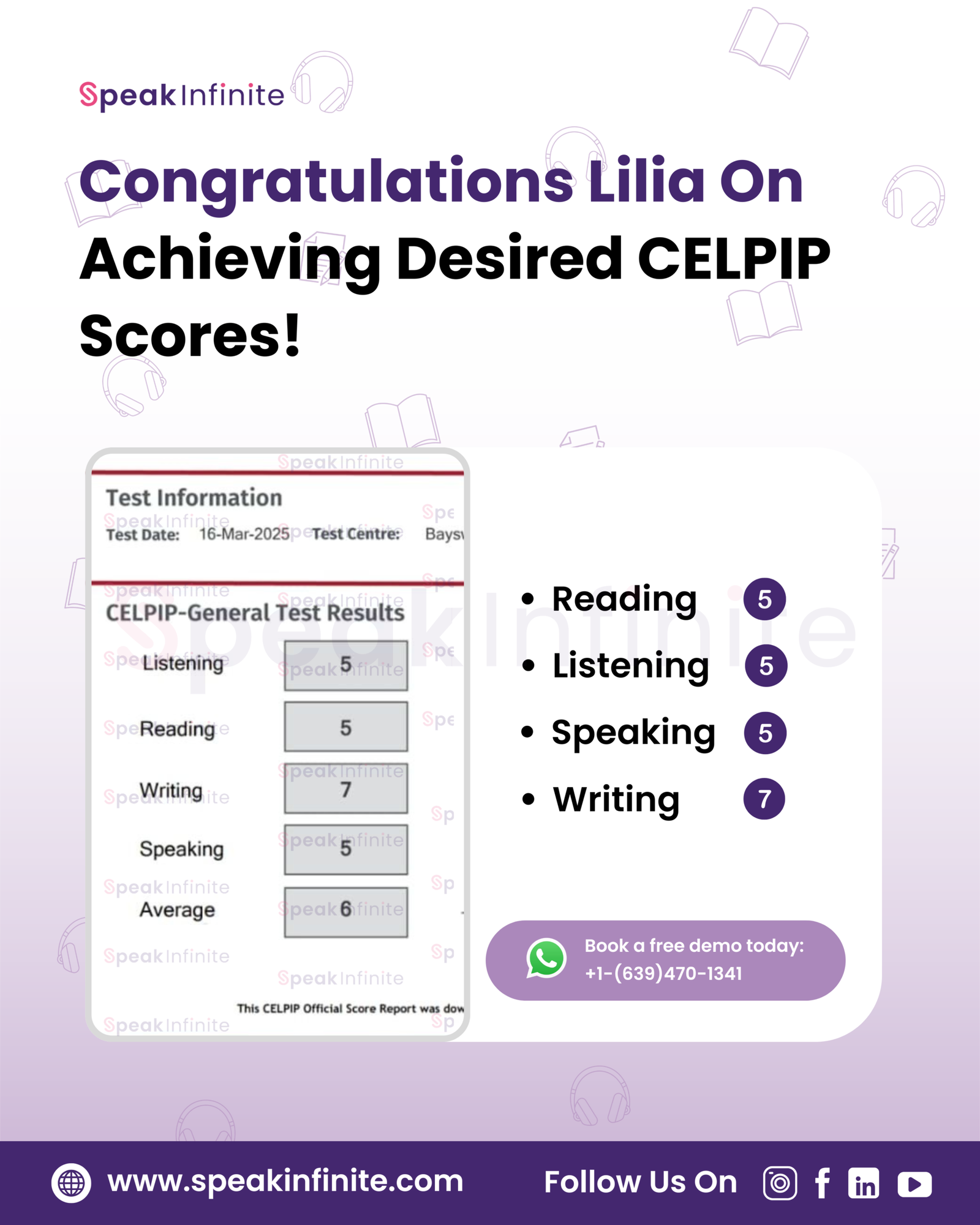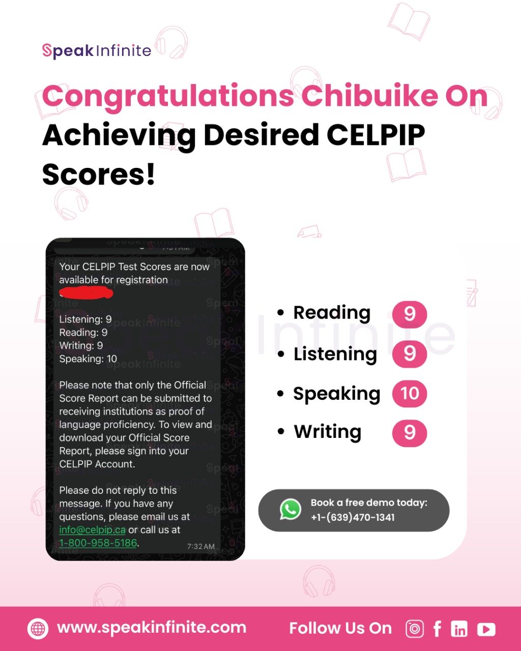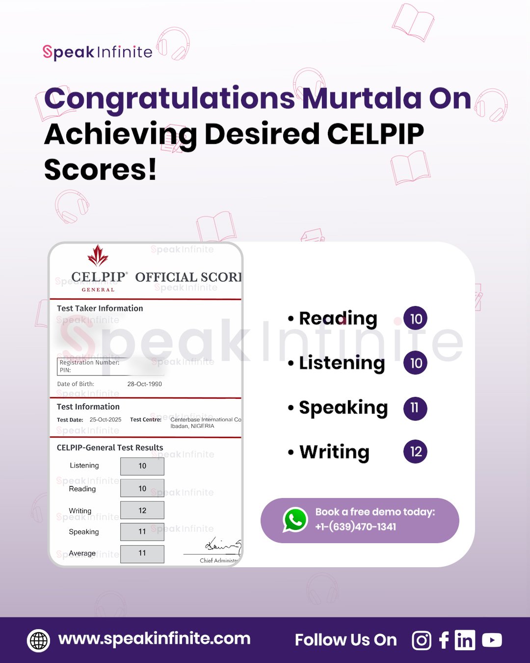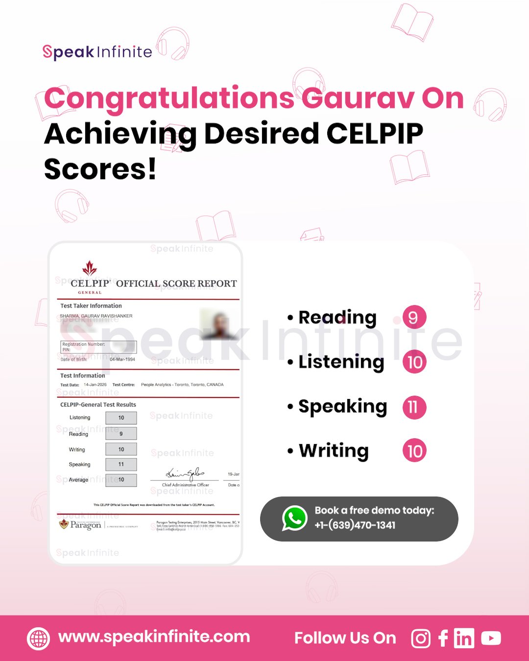 Posted on samson damilolaTrustindex verifies that the original source of the review is Google. I am happy to say Speak infinite is a good place to learn and I recommend it for anyone that want to do English test. I just had 3 days of teaching and went for my CELPIP, which turns out successful.Posted on Chelimo Mercy YeshoTrustindex verifies that the original source of the review is Google. I want to appreciate my instructor Vinn for the tremendous effort she put in to see I passed my CELPIP exam which I attempted last week! You’re truly incredible!!Posted on Ionela TopciuTrustindex verifies that the original source of the review is Google. This Institute helped me achieve more than my goal in the CELPIP General Evaluation. Thank you, Miss Indu, for your patience , your support and your perserverence! I will always remember how you pushed me to become my best! I recommend it to everyone who wants the best results for this evalution, they are the best!Posted on shiffali kaushalTrustindex verifies that the original source of the review is Google. they are very good. Mehnoor is amazing in breaking down the strategies and helped me to get my perfect score👍👍👍Posted on NDAYIZEYE NOETrustindex verifies that the original source of the review is Google. Dear Speak Infinite Team, I’m writing to express my deepest gratitude for the incredible support and guidance you provided throughout my CELPIP journey. After facing many challenges and setbacks with this test, joining your program truly made all the difference. The dedication, professionalism, and care your team showed helped me grow in confidence and finally achieve the success I had been working toward for so long — and I was able to reach my goal in a very short time. I especially want to thank the teacher who took the time to guide me with patience and clarity. Your encouragement and belief in me meant more than I can say. You not only helped me improve my skills, but also gave me the motivation to keep going when I felt discouraged. Thank you so much for everything you’ve done. I will always be grateful for the role you played in helping me move forward. Warm regards, NoePosted on welkinTrustindex verifies that the original source of the review is Google. The instructor was experienced and professional, and the comprehensive materials were helpful. She noticed my struggles with reading and provided targeted support which helped me to get Band 9. I recommend them for achieving your target score.Posted on Victor LawrenceTrustindex verifies that the original source of the review is Google. I had issues passing my CELPIP ENGLISH TEST, so I enrolled with Speak Infinite Educational Services for training. They have very good trainers and very good training resources that helped me to get the required scores I was looking for.The strategy videos I watched, explained everything in detail. I learnt how to tackle the reading section quickly. I also practiced with their online Test portal that analysed my performance and showed me the areas I need to improve on. I recommend Speak Infinite Educational Services to any one that wants to have a high score in their English Test ( CELPIP or IELTS).Posted on Helen AdenijiTrustindex verifies that the original source of the review is Google. I joined Speak Infinite after struggling to pass my exam three times. The program offered a structured way of learning that broke complicated celpip parts into manageable lessons. What stood out most was the patience and dedication of the team, they made sure I understood concepts instead of just memorizing them. The practice tests, mock test and feedback sessions were especially helpful; they showed me where I kept making mistakes and gave me the confidence to tackle the exam differently. The guidance I received through this program was what finally helped me cross the finish line and pass. If you’ve faced repeated setbacks like I did, I’d recommend Speak Infinite. It doesn’t promise shortcuts, but it gives you the tools, support, and encouragement to finally succeed.Posted on Sameer AryanTrustindex verifies that the original source of the review is Google. I had the honour of meeting Shweta Ma’am, I opted for one on one session and I can not express in words how thankful I am to her. She has the knowledge, experience and patience to teach you the required skills. I practiced day in and day out after her sessions and thanks to Shweta Ma’am, my CELPIP score was 11!!!! All I can say is, just trust her teachings and PRACTICE all the Homework she allocates!!! Thank you immensely Dear Shweta Ma’am!!!Posted on Jasleen KaurTrustindex verifies that the original source of the review is Google. Speak Infinite has been an incredible support throughout my CELPIP preparation journey. Special thanks to Jankee mam for her valuable guidance in helping me achieve my desired scores. I also appreciate the chat representative who responded to all my inquiries promptly and professionally. I would highly recommend Speak Infinite to anyone preparing for the CELPIP exam.