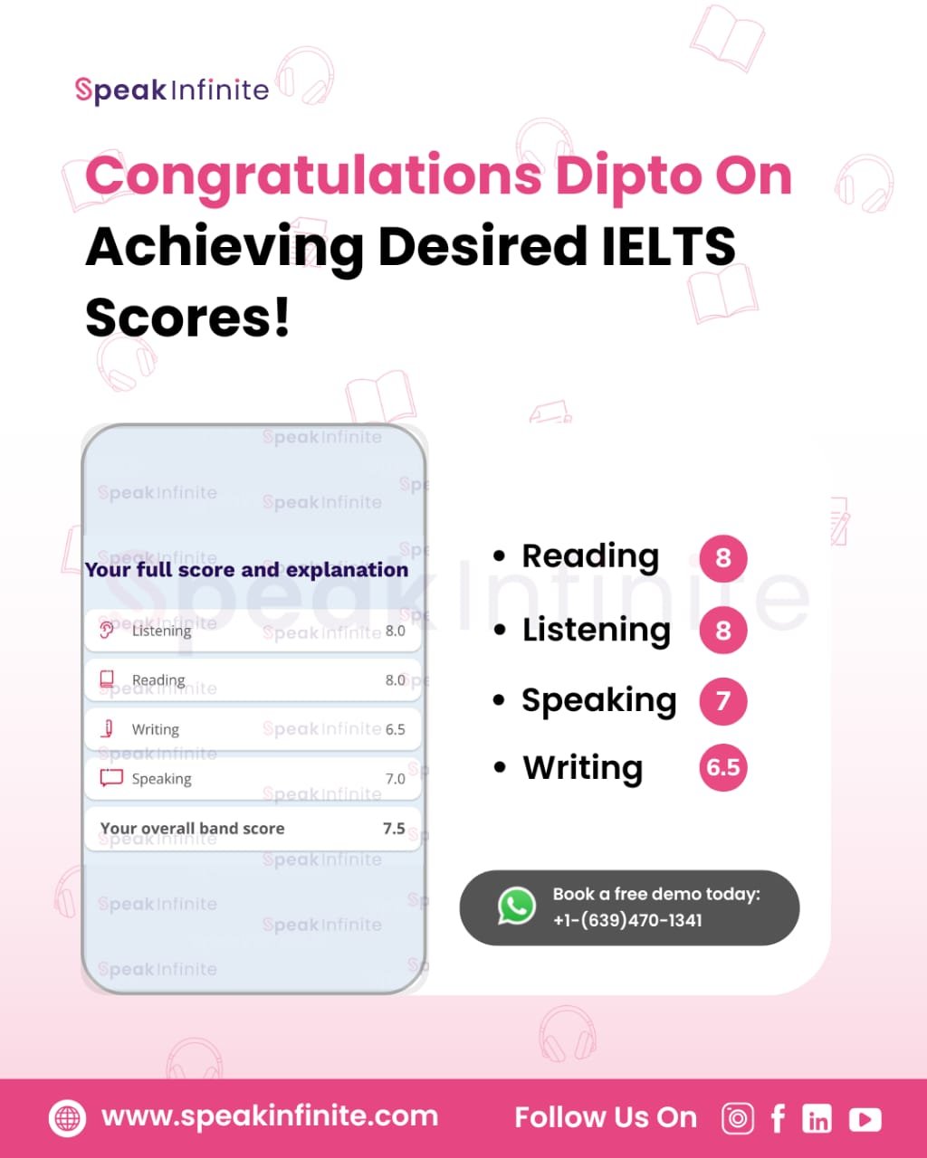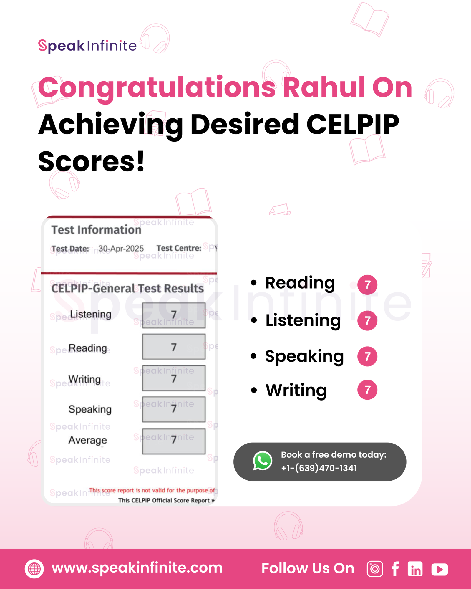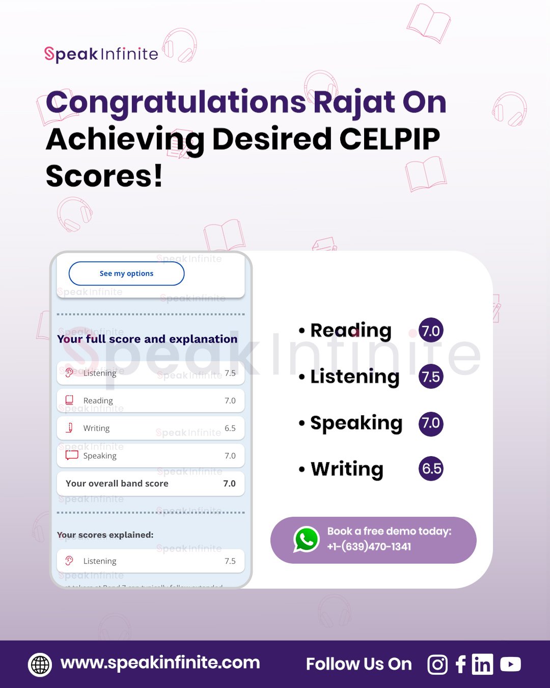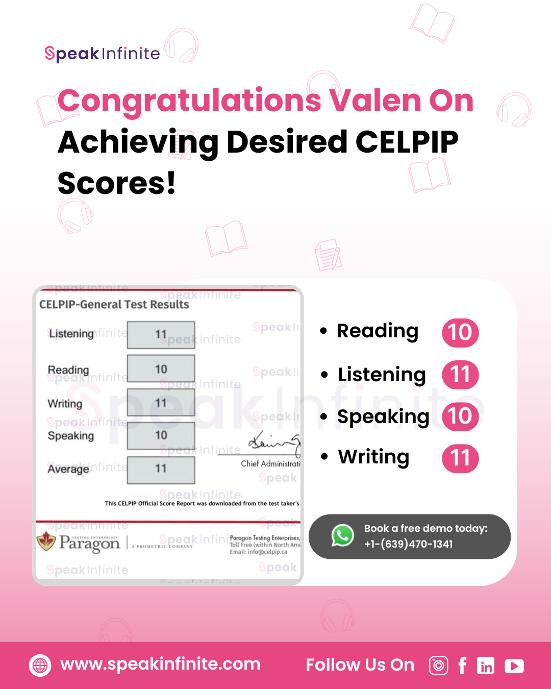 Posted on samson damilolaTrustindex verifies that the original source of the review is Google. I am happy to say Speak infinite is a good place to learn and I recommend it for anyone that want to do English test. I just had 3 days of teaching and went for my CELPIP, which turns out successful.Posted on Chelimo Mercy YeshoTrustindex verifies that the original source of the review is Google. I want to appreciate my instructor Vinn for the tremendous effort she put in to see I passed my CELPIP exam which I attempted last week! You’re truly incredible!!Posted on Ionela TopciuTrustindex verifies that the original source of the review is Google. This Institute helped me achieve more than my goal in the CELPIP General Evaluation. Thank you, Miss Indu, for your patience , your support and your perserverence! I will always remember how you pushed me to become my best! I recommend it to everyone who wants the best results for this evalution, they are the best!Posted on shiffali kaushalTrustindex verifies that the original source of the review is Google. they are very good. Mehnoor is amazing in breaking down the strategies and helped me to get my perfect score👍👍👍Posted on NDAYIZEYE NOETrustindex verifies that the original source of the review is Google. Dear Speak Infinite Team, I’m writing to express my deepest gratitude for the incredible support and guidance you provided throughout my CELPIP journey. After facing many challenges and setbacks with this test, joining your program truly made all the difference. The dedication, professionalism, and care your team showed helped me grow in confidence and finally achieve the success I had been working toward for so long — and I was able to reach my goal in a very short time. I especially want to thank the teacher who took the time to guide me with patience and clarity. Your encouragement and belief in me meant more than I can say. You not only helped me improve my skills, but also gave me the motivation to keep going when I felt discouraged. Thank you so much for everything you’ve done. I will always be grateful for the role you played in helping me move forward. Warm regards, NoePosted on welkinTrustindex verifies that the original source of the review is Google. The instructor was experienced and professional, and the comprehensive materials were helpful. She noticed my struggles with reading and provided targeted support which helped me to get Band 9. I recommend them for achieving your target score.Posted on Victor LawrenceTrustindex verifies that the original source of the review is Google. I had issues passing my CELPIP ENGLISH TEST, so I enrolled with Speak Infinite Educational Services for training. They have very good trainers and very good training resources that helped me to get the required scores I was looking for.The strategy videos I watched, explained everything in detail. I learnt how to tackle the reading section quickly. I also practiced with their online Test portal that analysed my performance and showed me the areas I need to improve on. I recommend Speak Infinite Educational Services to any one that wants to have a high score in their English Test ( CELPIP or IELTS).Posted on Helen AdenijiTrustindex verifies that the original source of the review is Google. I joined Speak Infinite after struggling to pass my exam three times. The program offered a structured way of learning that broke complicated celpip parts into manageable lessons. What stood out most was the patience and dedication of the team, they made sure I understood concepts instead of just memorizing them. The practice tests, mock test and feedback sessions were especially helpful; they showed me where I kept making mistakes and gave me the confidence to tackle the exam differently. The guidance I received through this program was what finally helped me cross the finish line and pass. If you’ve faced repeated setbacks like I did, I’d recommend Speak Infinite. It doesn’t promise shortcuts, but it gives you the tools, support, and encouragement to finally succeed.Posted on Sameer AryanTrustindex verifies that the original source of the review is Google. I had the honour of meeting Shweta Ma’am, I opted for one on one session and I can not express in words how thankful I am to her. She has the knowledge, experience and patience to teach you the required skills. I practiced day in and day out after her sessions and thanks to Shweta Ma’am, my CELPIP score was 11!!!! All I can say is, just trust her teachings and PRACTICE all the Homework she allocates!!! Thank you immensely Dear Shweta Ma’am!!!Posted on Jasleen KaurTrustindex verifies that the original source of the review is Google. Speak Infinite has been an incredible support throughout my CELPIP preparation journey. Special thanks to Jankee mam for her valuable guidance in helping me achieve my desired scores. I also appreciate the chat representative who responded to all my inquiries promptly and professionally. I would highly recommend Speak Infinite to anyone preparing for the CELPIP exam.